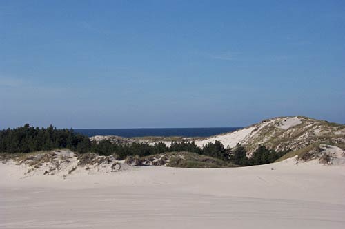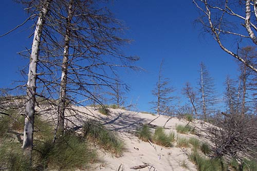 Na odcinku długości 5 km obserwować możemy najrozleglejsze na wybrzeżu, a zarazem najwyższe wydmy ruchome zwane "Białymi Górami". Oprócz form wydmowych, związanych z akumulacyjną działalnością wiatru znajdują się tu świadectwa zgoła odmiennej jego aktywności. W wyniku procesu deflacji tworzą się strefy wywianego piasku, zwane obniżeniami deflacyjnymi. Stanowią one obiekty badań pierwotnej sukcesji roślinnej, przebiegającej od inicjalnych zbiorowisk psammofilnych po bór sosnowy. Wśród roślin uczestniczących w kolonizacji pól deflacyjnych wymienić należy, oprócz typowej roślinności wydm nadmorskich i gatunków borowych, trzy gatunki rosiczek, w głębi lądu spotykanych na torfowiskach wysokich.